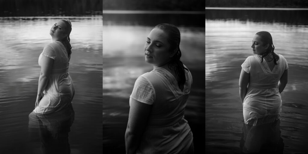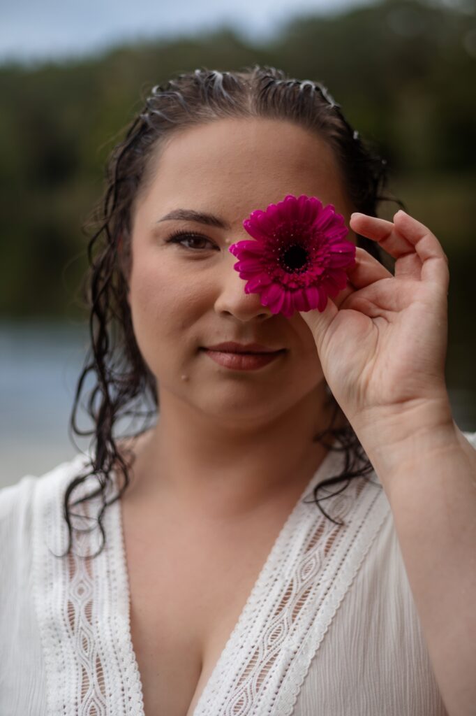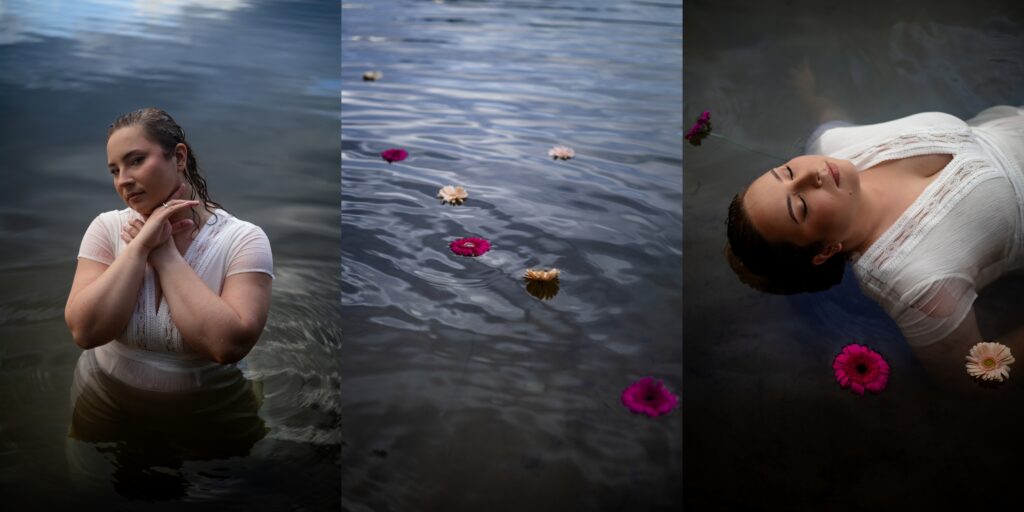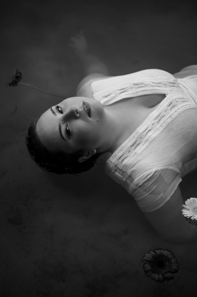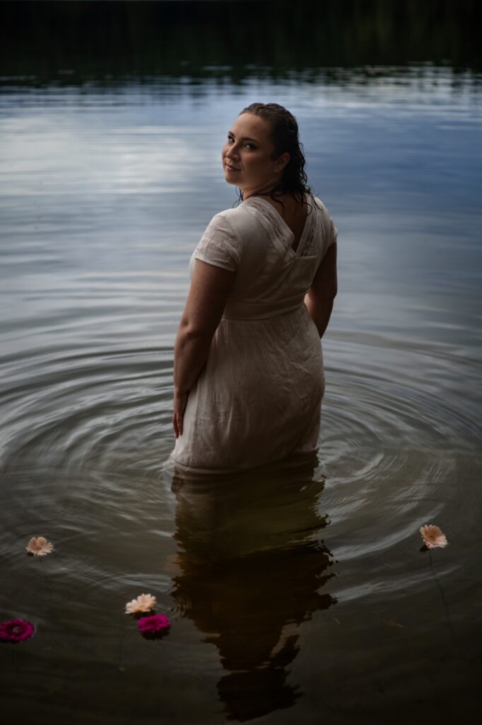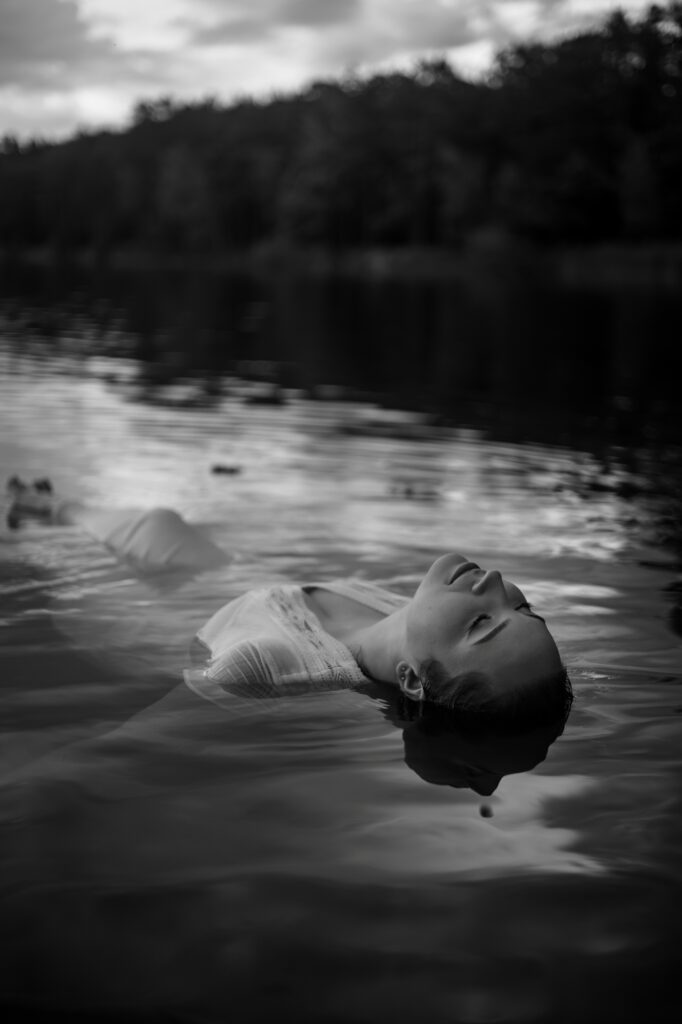 Umówiłyśmy więc sesję pod Opolem, nad spokojnym jeziorem, które tego dnia wyglądało kojąco i spokojnie. Marta zanurzała się powoli w wodzie. Na powierzchni unosiły się kwiaty – gerbery o wyrazistym kolorze, dodające całej scenie poetyckiego wyrazu. A w odbiciach wody tańczyły chmury, tworząc świat, który wyglądał jak sen – miękki, lustrzany.