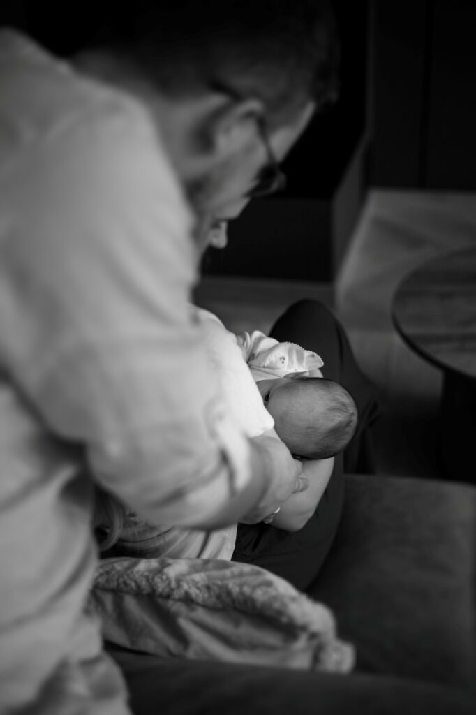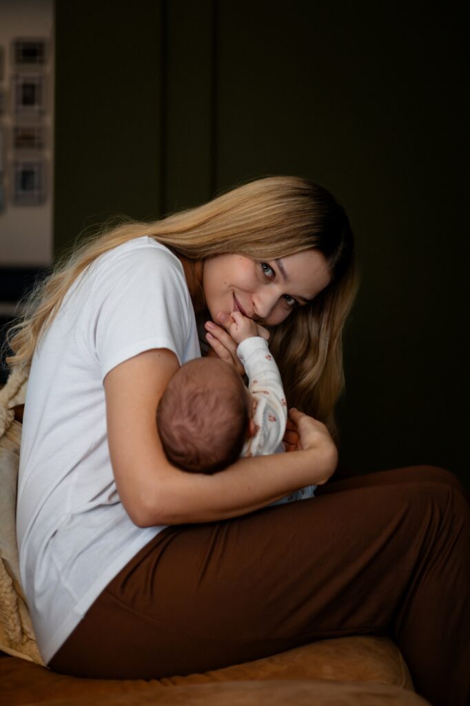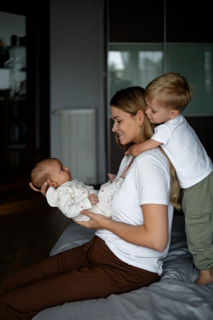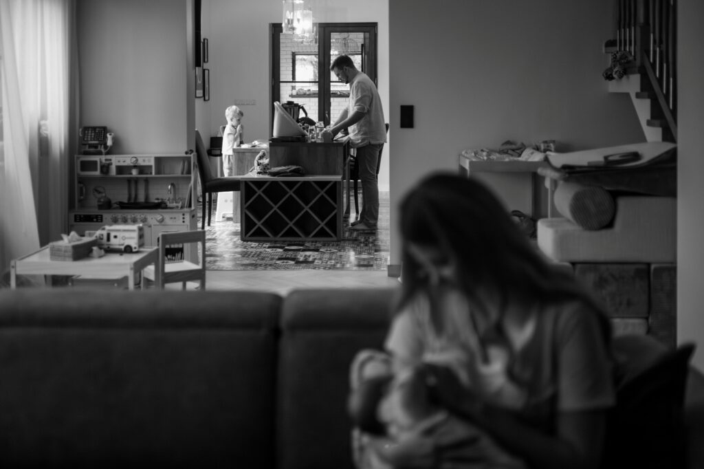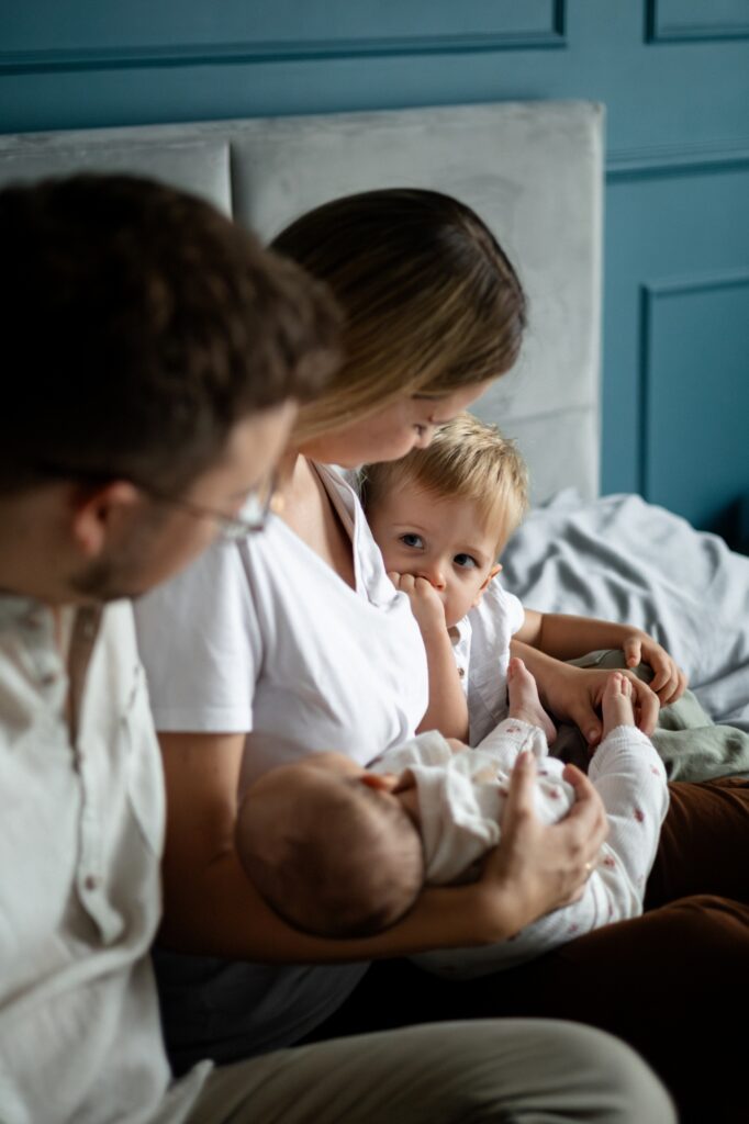 W takich warunkach zdjęcia robią się same. Nie trzeba ich wymuszać. Wystarczy cierpliwość i zgoda na to, że każdy moment jest ważny – karmienie, wspólne siedzenie na kanapie, szybkie spojrzenie starszego dziecka, dotyk małej dłoni.
