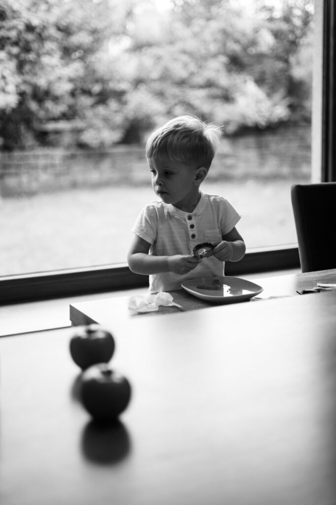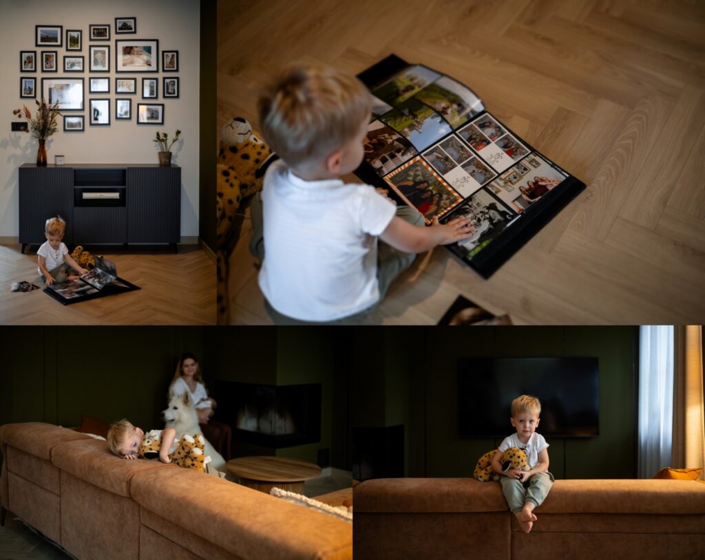 Domowa sesja to nie teatr. To codzienność, która po prostu dzieje się obok. Życie toczy się swoim rytmem – starszy brat je wtedy, kiedy jest głodny, podjada kawałek chleba przy stole, a za chwilę z ciekawością sięga po albumy pełne zdjęć i rozkłada je na podłodze. Nikt go nie zatrzymuje, nikt nie mówi „teraz nie”. I właśnie w tym jest cała magia.